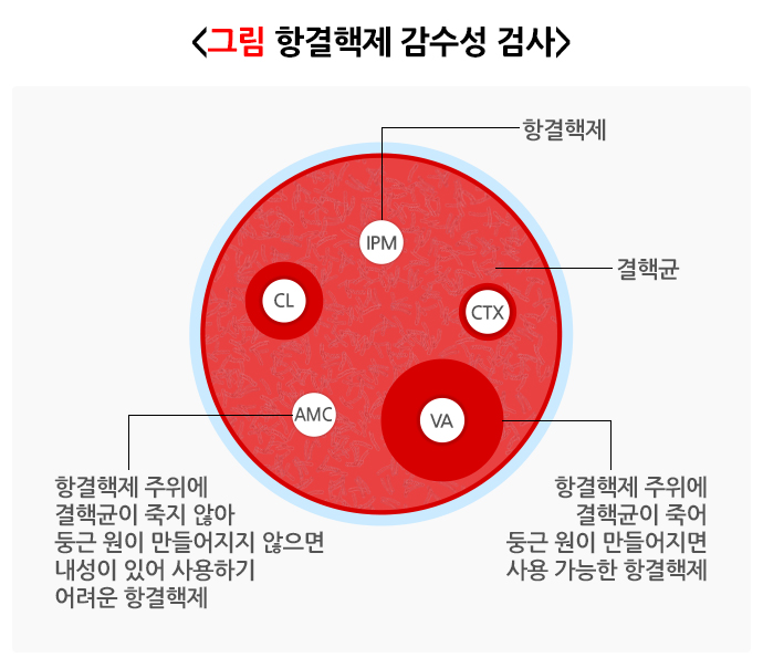 모든 결핵환자의 배양균주에 대해 이소니아지드와 리팜핀에 대한 신속감수성검사와 이소니아지드와 리팜핀을 포함한 여러 항결핵 약제에 대한 통상감수성검사를 함께 시행합니다.