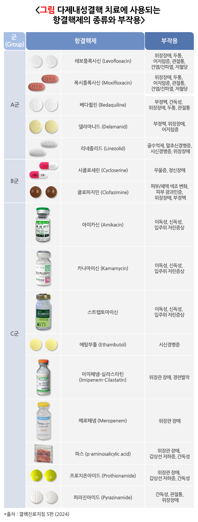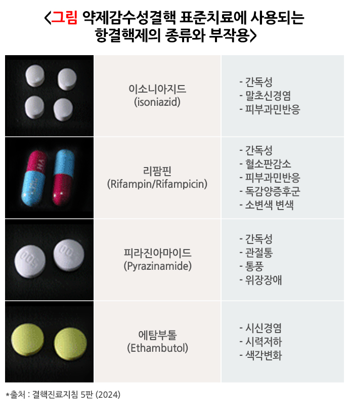 ● 피라진아미드: 치료 초기에 염증 병변이나 괴사 부위에 있는 결핵균을 살균하는 효능이 있어 초기 2개월 동안 사용됩니다. 부작용으로는 간독성, 관절통, 통풍 등이 있습니다.