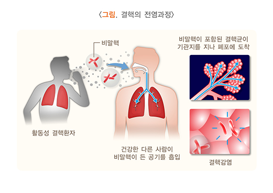결핵균은 항산균이라고 하는 세균의 일종으로, 주로 치료받지 않은 활동성 폐결핵 환자가 기침, 재채기, 말할 때 나오는 미세한 침방울에 섞여 있으며, 이를 호흡기로 흡입하면 결핵에 감염됩니다. 폐결핵 환자로부터 배출되는 균의 수, 폐 질환의 정도, 기침 횟수에 따라 감염 가능성이 달라집니다. 밀폐된 공간에서는 균의 농도가 짙어 감염 위험이 증가하는 반면, 실외에서는 결핵균이 햇빛(자외선)에 노출되면 활동성이 떨어져서 거의 전염이 일어나지 않습니다. 활동성 폐결핵 환자들도 적절한 결핵 치료를 받으면 약 2주 후부터 전염성이 크게 떨어집니다. 결핵 환자와 밀접 접촉한 사람 중 약 30%가 감염이 되지만 결핵균에 감염되더라도 모두 발병하는 것은 아닙니다. 감염된 사람 중 약 10%에서 발병을 하는 것으로 알려져 있습니다. 그 중 절반(5%)은 감염된 후 1~2년 이내에 발병하고 이후 급격히 발병률이 떨어집니다. 다만 평생에 걸쳐 발병할 수 있습니다.