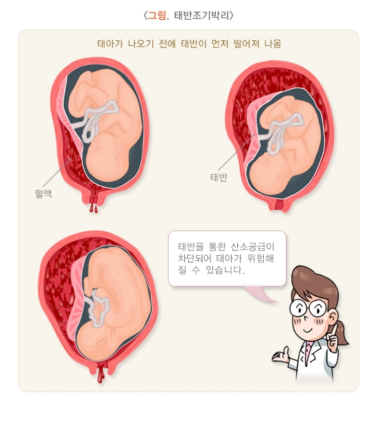 태반조기박리는 태아가 나오기 전에 태반이 박리되는 것을 말합니다. 신생아 가사와 비슷한 상황으로, 태아의 호흡기계 질환이나 뇌성마비 같은 발달장애를 동반할 수 있습니다. 태반조기박리가 있으면 만삭 분만해도 태아 혹은 신생아 사망률이 25배나 증가할 정도로 심각한 질환입니다.