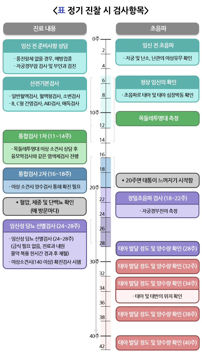 임신 초기에 특별한 문제가 없었더라도 임신 중 다양한 질환이 나타나 고위험 임신으로 진단될 수 있기 때문에 임신 시기에 따라 적절한 검사가 필요합니다. 이러한 검사는 대부분 정해진 시기가 있으므로 정기적으로 병원을 방문해 산전 진찰을 받는 것이 고위험 임신 대처나 예방에 필수적입니다.