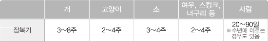 잠복기는 평균 3~8주이나 아주 드물게 수 일 만에 발병하거나 수 년 후에야 발병하는 경우에 이르기까지 매우 다양합니다. 다친 정도나 부위에 따라서도 달라지는데, 머리에서 가까운 부위를 물리면 잠복기가 짧아집니다.