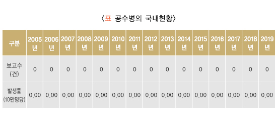 국내에서는 1963년과 1966년에 100건 내외가 보고되었습니다. 1984년 이후 발생 보고가 없다가 1999년 1명(경기), 2001년 1명(강원), 2002년 1명(강원), 2003년 2명(경기), 2004년 1명(경기)이 발생하여 모두 사망하였습니다. 2005년부터 현재까지는 발생 보고가 없습니다.