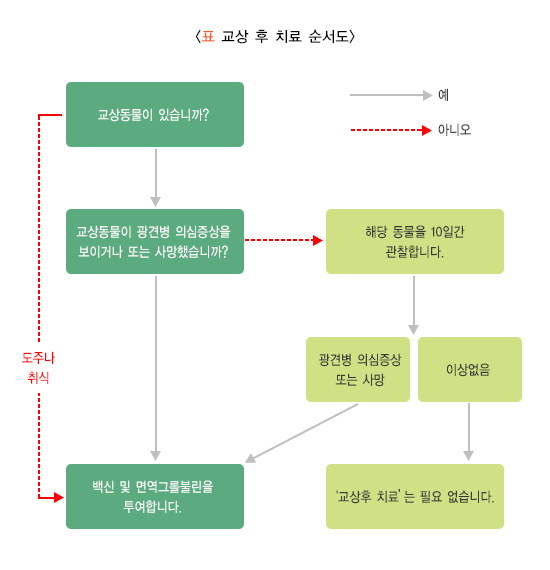 광견병 동물에 교상당한 것이 확실한 경우, 위험 지역에서 동물(가축, 애완동물)에 교상당한 경우, 광견병 여부 판단이 불가능한 경우, 교상 동물이 도주한 경우에는 면역글로불린(human rabies immunoglobulin, HRIG)과 백신을 투여합니다. 동물을 10일간 관찰하여 광견병 증상이 없으면 투여하지 않거나, 투여를 중단할 수 있습니다. 면역력 여부에 따라 치료가 달라질 수 있습니다.