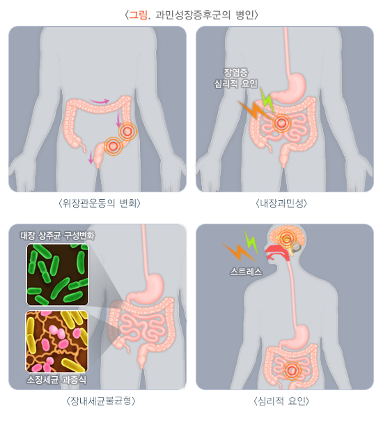 과민성장증후군은 위장관 운동의 변화, 내장과민성, 유전적 요인, 장내세균 불균형, 담즙산 흡수장애 등의 다양한 원인이 복합적으로 작용하여 질병을 일으킨다고 추정하고 있습니다.