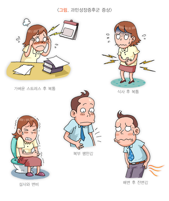 과민성장증후군의 전형적인 증상은 아랫배가 아프고, 배변 습관이 바뀌는 것입니다. 그러나 복통이 심해도 변을 보고 나면 증상이 대개 없어집니다. 점액질 변, 복부팽만이나 잦은 트림, 방귀, 전신피로, 두통, 불면, 어깨 결림 등의 증상도 나타나지만 몇 개월에서 몇 년씩 계속되더라도 몸 상태는 별 이상이 없습니다.