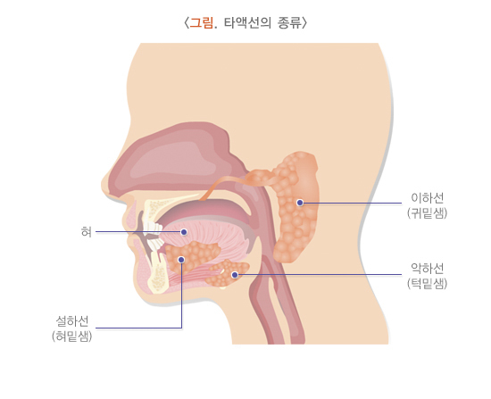 타액선, 즉 침샘은 이하선, 악하선, 설하선 및 소타액선으로 구성됩니다. 이하선(귀밑샘), 악하선(턱밑샘), 설하선(혀밑샘)은 좌우에 각각 한 개씩 위치합니다.