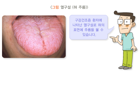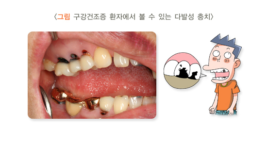 • 구강건조증이 있는 사람은 충치나 치은염이 흔히 생기므로 정기적으로 치과를 방문하는 것이 좋습니다.