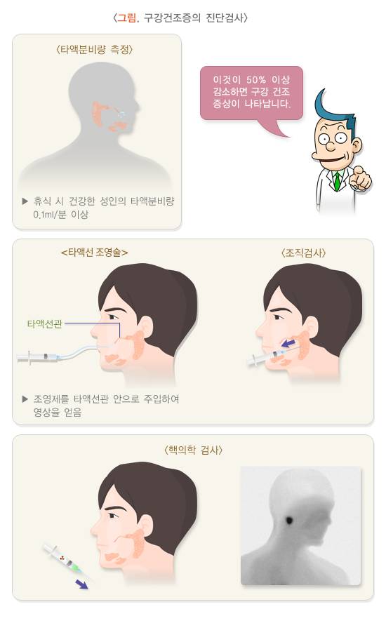 구강건조증의 원인을 확인하기 위해 혈액검사(혈구수 측정, 간기능검사, 신장기능검사, 자가항체검사, 혈당측정), 요검사 등을 시행할 수 있습니다.