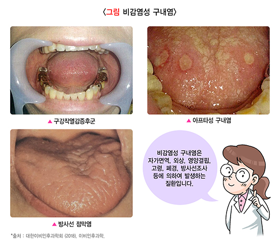 비감염성 구내염은 자가 면역, 외상, 영양 결핍, 고령, 폐경, 방사선 조사 등에 의하여 발생하는 질환이며, 대표적인 질환으로는 ①아프타 구내염, ②구강 작열감 증후군, ③방사선 점막염이 있습니다.