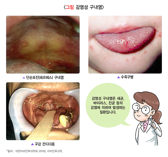 감염성 구내염은 세균, 바이러스, 진균 등의 감염에 의하여 발생하는 질환이며, 대표적인 질환으로 ①단순포진(헤르페스) 구내염, ②수족구병, ③구강 칸디다증이 있습니다.