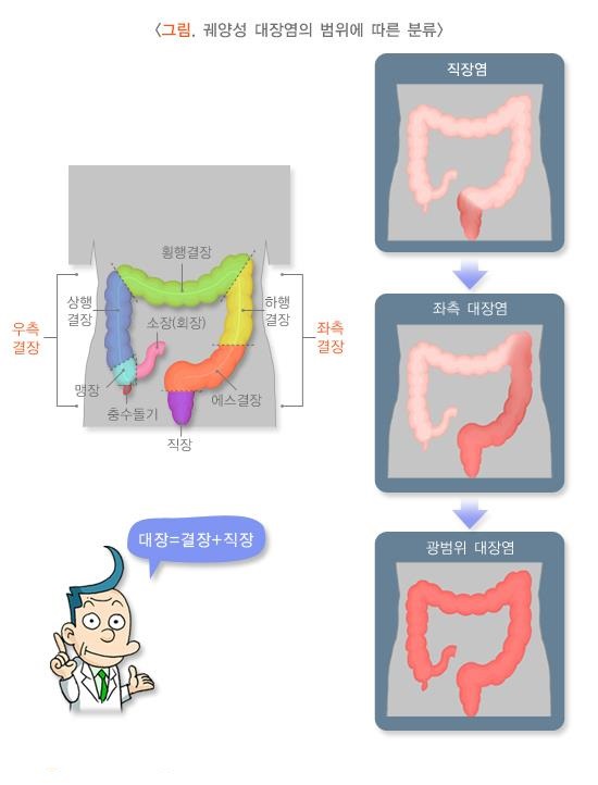 궤양대장염은 염증의 대장 침범 범위에 따라 세 종류로 구분할 수 있습니다. 염증이 직장에만 국한되어 있는 경우 '직장염', 직장부터 왼쪽 대장까지 염증이 있는 경우를 '좌측 대장염', 직장부터 오른쪽 대장까지 전체 대장에 염증이 있는 경우를 '광범위 대장염'이라 부릅니다. 대부분 환자에서 직장에 염증이 있으며, 약 1/2의 환자에서는 직장부터 구불결장까지, 1/4은 직장부터 구불결장과 왼쪽 대장까지, 그리고 나머지 1/4은 직장으로부터 횡행결장 또는 오른쪽 대장에 이르기까지 대장 전체에 염증이 존재합니다.
