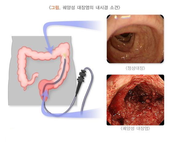궤양대장염은 소화관 중 대장에 국한되어 장 벽에 염증 또는 궤양이 발생하는 질환으로 아직 정확한 원인이 밝혀지지 않은 만성 재발 질환입니다. 흔한 증상은 만성으로 지속되는 혈변, 설사와 대변 절박증, 뒤무직 및 복통입니다. 궤양대장염에서 병적인 변화는 항문에 인접한 직장에서 시작되어 점차 안쪽으로 진행되는데, 병적인 변화가 여기저기 흩어져 있지 않고 모두 연결되어 있다는 특징이 있습니다. 염증이 지속되면, 드물지만 협착, 천공 등의 합병증이 발생할 수 있고, 만성염증의 결과로 대장암이 발생할 수도 있습니다. 하지만 궤양대장염을 정확히 진단받고 환자와 의료진의 공동노력으로 꾸준히 치료와 관리를 하면, 일반인과 차이없는 삶의 질과 수명을 유지할 수 있습니다.