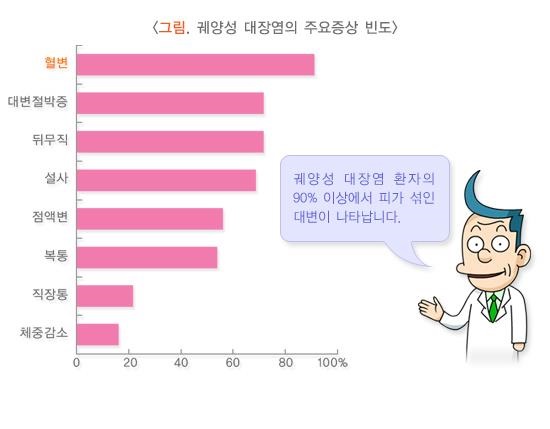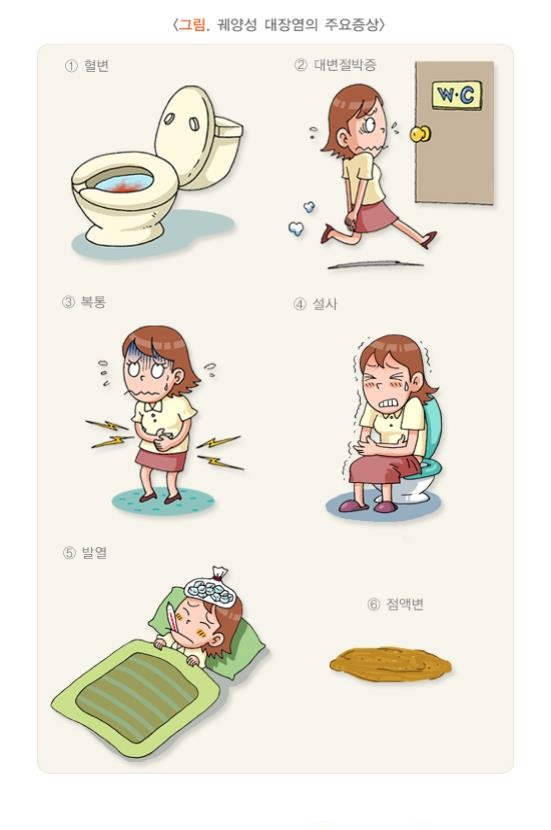 궤양대장염의 임상증상은 대장의 침범범위와 염증의 심한 정도에 따라 차이가 있으나 혈변, 설사, 대변 절박증을 호소하며, 그 외 뒤무직, 점액질 대변, 야간설사(설사로 인해 자다 깸), 경련성 하복부 통증 및 불쾌감 등이 발생할 수 있습니다. 가장 흔한 증상은 혈변과 설사이며, 그 외 심한 경우에는 식욕부진, 오심, 구역, 구토, 발열, 부종, 전신 쇠약감, 체중 감소 등이 발생할 수 있습니다. 증상은 갑자기 발생할 수도 있으나 대개는 천천히 발생하며, 수 주일에서 수 개월 동안 증상을 호소하며 병원에 오게 됩니다. 또한 대부분의 증상은 호전과 악화를 반복하는 만성 경과를 보이게 됩니다.