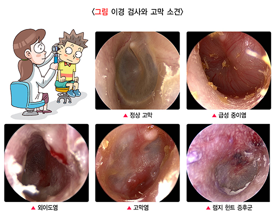 귀 통증이 있을 경우 귀는 물론 머리와 목을 함께 진찰해야 합니다. 이경이나 이내시경으로 외이도와 고막, 중이의 이상 유무를 확인하는 귀 진찰이 필수적이며, 코(비경, 비내시경 이용)와 후두 진찰(후두경, 후두내시경 이용)이 필요할 수도 있습니다.