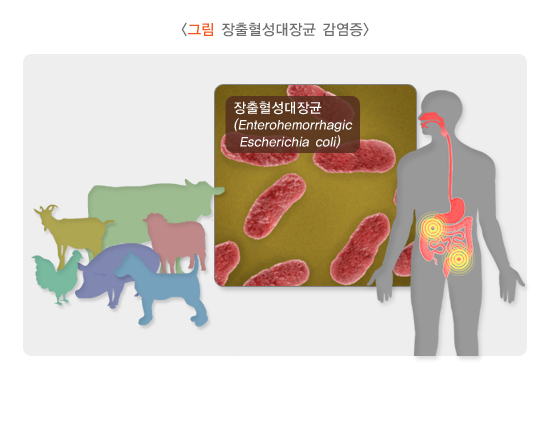 출혈성 장염을 일으키는 질환입니다. 원인균은 소, 양, 염소, 돼지, 개, 닭 등 가금류의 대변에서 시가(Shiga) 독소를 생성하는 대장균(E. coli)이며, 소가 가장 중요한 병원소입니다. 장출혈성대장균은 소의 장내에 존재할 수 있는데 도축과정이나 가공과정에서 오염된 쇠고기를 충분한 온도로 가열하지 않고 조리하는 경우 균이 죽지 않고 살아남아 사람을 감염시킵니다. 대부분의 발생은 소고기로 가공된 음식물에 의하며, 집단 발생은 조리가 충분치 않은 햄버거 섭취로 발생하는 예가 많습니다.