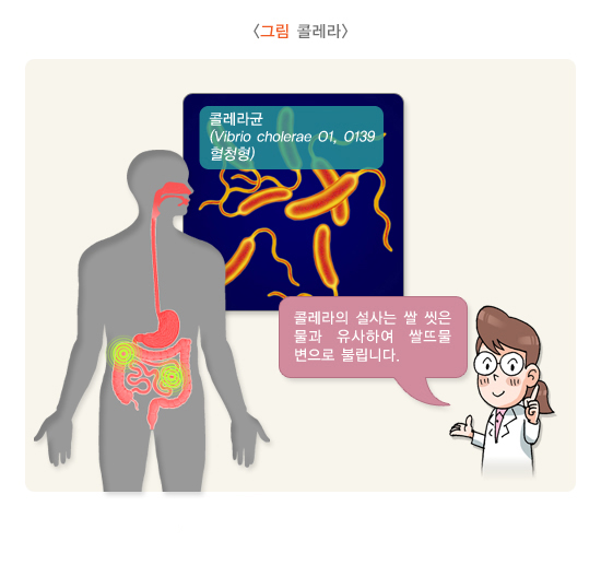 콜레라는 6시간~5일(대체로 24시간 이내 증상 발현)의 잠복기 후에 갑작스럽게 나타나는 통증 없는 물설사로 시작하여 급속히 설사량이 많아지며 흔히 곧바로 구토가 뒤따릅니다. 설사는 특징적으로 비담즙성, 회색, 점액반점이 포함된 약간 혼탁한 용액으로 피가 섞이지는 않고 약간 달고 거슬리지 않는 냄새 등이 있어 흔히 쌀 씻은 물과 유사하여 쌀뜨물 변으로 불립니다. (심한 경우에는 250mL/kg 이상) 복통 및 발열은 거의 없으나, 증세가 심한 경우에 동반되기도 합니다. 무(無)증상 감염이 더 흔하며, 무증상 감염은 특히 엘토르형에서 많습니다.