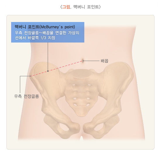급성 충수염을 진단할 때 가장 중요한 것은 충수가 위치한 부위를 눌렀을 때 통증(압통)이 있는지 여부입니다. 이 부위를 ‘맥버니 포인트’라고 하는데, 배꼽과 골반 앞부분이 튀어나온 뼈를 연결한 가상의 선에서 바깥쪽 3분의 1 지점에 위치합니다.