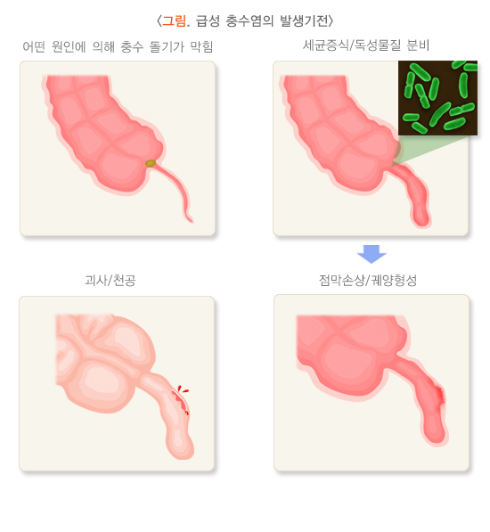 기본적으로 급성 충수염은 어떤 원인에서든지 충수 내부가 막히면서 시작됩니다. 충수가 막히게 되면 충수로부터 대장으로 향하는 정상적인 장의 연동운동이 제한됩니다. 고인 물이 썩듯이 저류가 일어난 상태에서 장내 세균이 증식하고 독성 물질을 분비하게 됩니다. 그러면 이 물질들에 의해서 충수 내부 점막이 손상 받고 궤양을 형성하게 됩니다. 이후 충수 내부의 압력이 증가되면 충수로 가는 동맥혈의 흐름이 저하되고 충수 벽이 괴사되어 천공으로 진행됩니다.