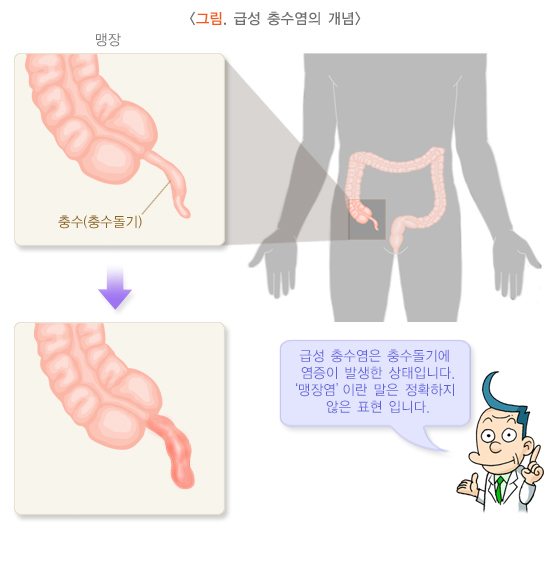 우리 몸의 소화기관은 음식을 씹고 삼키는 입(구강)으로부터 식도, 위, 소장, 대장을 거쳐 항문을 통해 이루어져 있습니다. 그 중에서 소장에서 대장으로 이어지는 부위에 맹장이라고 불리는 소화기관이 있고, 맹장에 붙어 있는 작은 주머니가 바로 충수돌기입니다. 충수염은 맹장에 붙어있는 이 충수라는 작은 기관에 염증이 생기는 질환이므로, 맹장염이라고 하기보다는 급성 충수염으로 부르는 것이 의학적으로 맞는 용어입니다.