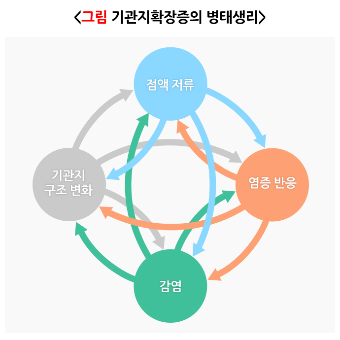 염증 반응이 생기면 점액이 과도하게 생성되며, 기관지 벽이 손상되어 생성된 점액이 제대로 배출하지 못합니다.