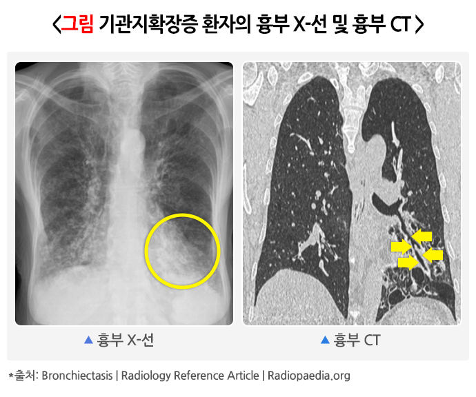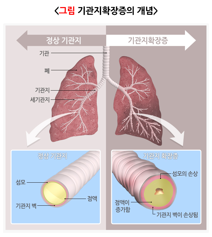 기관지확장증이란 기관지 벽의 근육 및 탄력 성분이 파괴되어 영구적으로 늘어난 상태로 기침, 가래, 호흡곤란, 반복적인 호흡기 감염이 특징적으로 나타납니다.