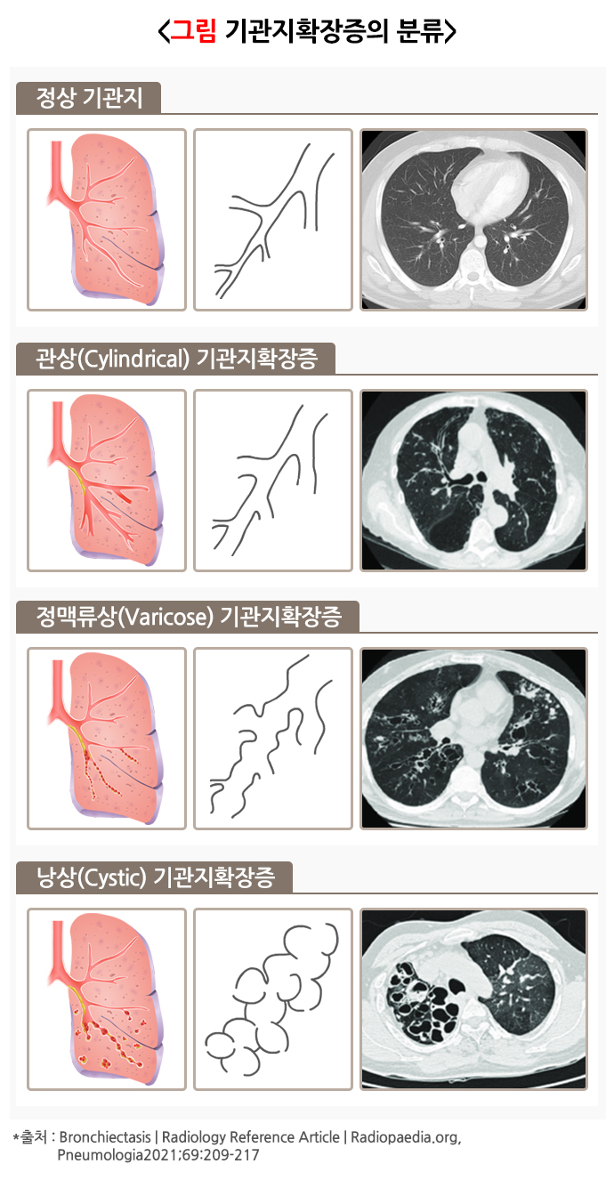 기관지확장증은 확장된 모양에 따라 3가지로 나뉘는데 만성도 및 중증도를 반영한다고 알려져 있습니다.