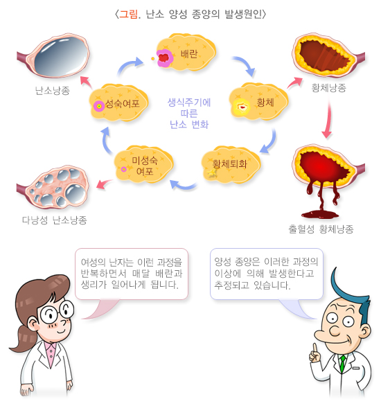 난소 양성종양의 정확한 원인은 아직 밝혀지지 않았지만, 지속적인 배란이나 외부 자극에 의해 상피세포가 난소 내부로 함몰되면서 낭종이 형성되고, 그 안에 액체가 고여 크기가 점점 커진다는 가설이 가장 유력합니다.
