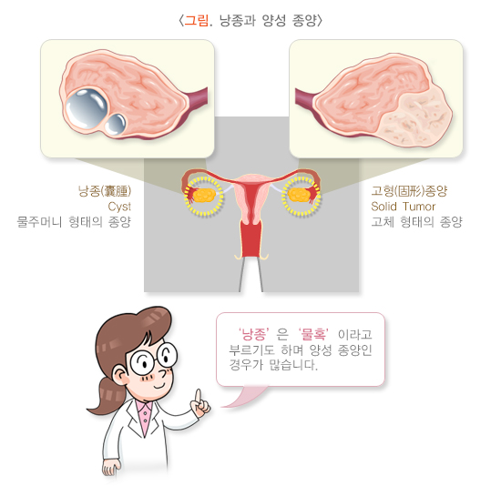 난소에는 다양한 종양이 생길 수 있는데 크게 암에 해당하는 악성종양과 암이 아닌 양성종양으로 나눌 수 있습니다.