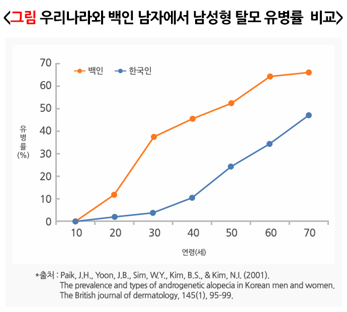 남성형 탈모는 성별에 관계없이 청소년기(사춘기) 이후부터 발생하기 시작하는데, 일반적으로는 20대 중반부터 시작됩니다. 2001년 국내 연구 결과에 따르면 우리나라와 백인 남성에서 남성형 탈모 유병률을 비교한 결과, 연령에 따라 유병률의 차이가 있었습니다. 정확한 연구 결과는 없지만 이러한 남성형 탈모는 과거에 비해 증가하고 있다고 추측됩니다. 또한 최근에는 사춘기 연령이 점차 낮아져 청소년기부터 남성형 탈모가 증가하는 추세입니다. 이는 식생활과 생활 습관이 서구화 되고 외부 환경 호르몬의 노출 증가에 따른 것으로 보고됩니다.