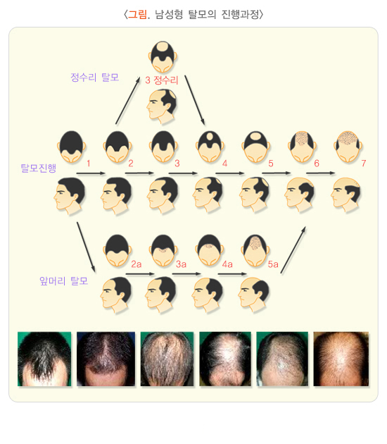 남성형 탈모가 생기는 가장 중요한 원인은 유전적인 소인과 남성 호르몬인 안드로겐입니다.