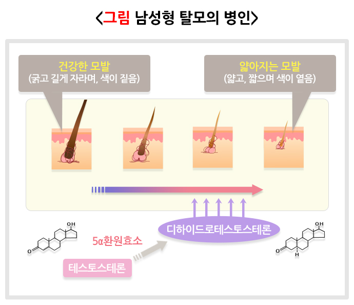남성형 탈모가 있는 사람들의 혈중 안드로겐 농도는 탈모가 없는 사람과 비슷한 것으로 알려져 있습니다. 다만 남성형 탈모가 있는 사람들은 탈모가 일어나는 특정 부위에만 탈모를 유발하는 강력한 안드로겐이 많이 생성됩니다. 우리 몸에는 여러 종류의 안드로겐이 있습니다. 이 중 테스토스테론은 모낭에 도달하여 5알파-환원효소(5α-환원효소)에 의해 더욱 강력한 안드로겐인 디하이드로테스토스테론(Dihydrotestosterone, DHT)으로 변환됩니다. 바로 이 디하이드로테스토스테론이 탈모를 유발하는 안드로겐으로 알려져 있습니다. 많은 연구 결과를 보면, 탈모 부위에서 디하이드로테스토스테론이 많이 생성되는데, 이는 5알파-환원효소의 활성이 높기 때문임을 알 수 있습니다. 따라서 남성형 탈모가 발생하는 것은 안드로겐의 양보다는 탈모 부위에서 5알파-환원효소의 역할이 더 중요하다는 것을 알 수 있습니다.