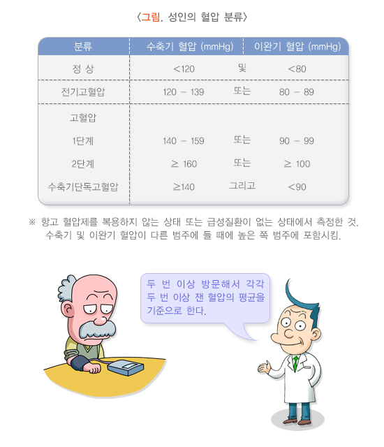 성인에서 혈압이 이완기 혈압은 90 mmHg 미만이고 수축기 혈압이 140 mmHg 이상일 때 고립성 수축기 고혈압(isolated systolic hypertension)으로 분류합니다. 이때도 치료의 필요성은 보통 고혈압과 같습니다. 그런데 노인 고혈압, 특히 수축기 고혈압일 때 진료실 혈압이 140/90 mmHg 이상이고 가정혈압은 135/85 mmHg 미만인 백의 고혈압 (white coat hypertension)의 빈도가 젊은 성인보다 더 흔하다고 알려졌습니다. 따라서 진료실에서의 혈압 측정 외에, 일상생활 중에 혈압을 관찰하는 24시간 혈압 측정 검사, 가정에서 측정한 혈압과 진료실 혈압의 비교가 도움이 됩니다. 특히 가정에서 측정한 혈압은 고혈압의 진단뿐만 아니라 환자의 순응도와 치료의 적극성, 조절상태 확인 등 고혈압 관리에 도움을 줍니다.