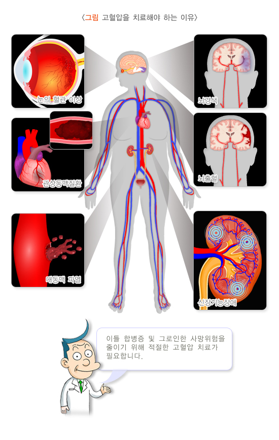 고혈압을 치료하지 않으면 전체 사망, 관상동맥질환에 의한 사망, 뇌경색, 출혈에 의한 사망 가능성, 대동맥류의 파열로 인한 사망 가능성 등이 증가합니다. 또한, 사망하지 않더라도 뇌경색이나 뇌출혈에 의한 합병증, 심장 기능 저하에 의한 합병증, 고혈압성 혈관 변성에 의한 신장 기능 장애와 눈의 혈관 이상 등으로 일상생활을 영위하기 어려울 가능성이 증가합니다.