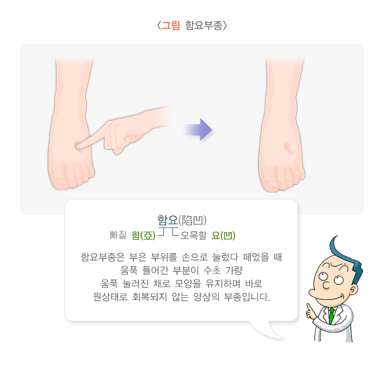 부종의 위치, 함요부종(pitting edema) 또는 비함요부종 여부, 부종 부위의 통증 동반 유무 및 피부 변화, 정맥류의 유무 그리고 전신질환(심부전, 신부전, 간부전, 악성종양)의 임상소견 동반 유무 등을 확인하게 됩니다. 함요부종은 부은 부위를 손으로 눌렀다가 떼었을 때 움푹 들어간 부분이 수 초간 지속되며 바로 원상태로 회복되지 않는 부종입니다. 함료부종이 흔하며, 비함요부종은 림프부종이나 갑상샘기능저하 시 보이는 점액 부종이 있습니다.