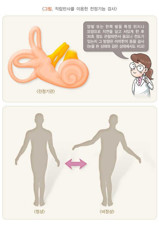 전정기능검사는 머리와 몸통이 바르게 설 수 있는지를 알아보는 직립반사 검사, 몸이 한쪽으로 치우치는지를 알아보는 편의 검사, 현기증이 있을 때 나타나는 환자의 율동적인 눈동자의 운동을 검사하는 안진 검사, 이런 눈동자의 운동을 일부러 유발하여 이를 전기적으로 측정하여 상세한 정보를 얻을 수 있는 전기안진법을 이용한 각종 유발안진검사, 환자의 귀(전정), 눈, 사지의 근육에 보내는 균형 정보를 받아들여서 이루어지는 자세의 이상을 검사하는 동적 자세 검사 등이 있습니다.