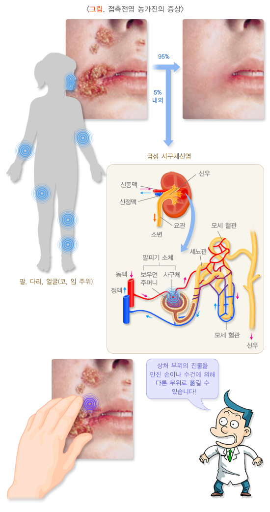 화농성 사슬알균에 의한 접촉전염 농가진 환자의 약 5%정도에서는 급성 사구체신염이 발생하기도 하는데, 피부에 병변이 생기고 2~3주 후 합병증으로 나타나게 됩니다. 이러한 신장염이 생기면 눈 주위나 하지에 부종이 생길 수 있지만 소아환자들은 대부분 후유증 없이 회복됩니다. 그 밖의 합병증으로 성홍열, 두드러기, 다형 홍반 등이 생길 수 있습니다.