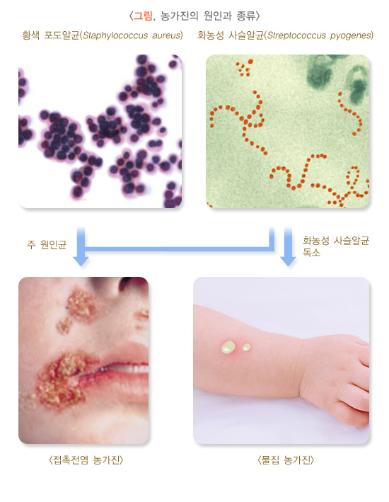 접촉전염 농가진의 주 원인균은 황색 포도알균(Staphylococcus aureus)이지만 덥고 습한 지역에서는 화농성 사슬알균(Streptococcus pyogenes)에 의하여 발생하기도 합니다.