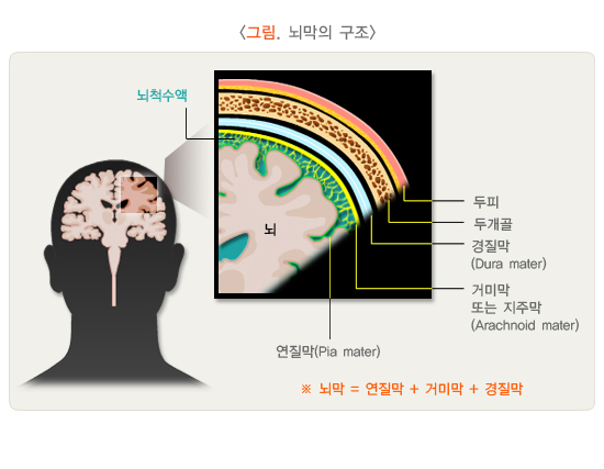 뇌척수막은 뇌를 싸고 있는 뇌막과 척수를 싸고 있는 척수막이 합쳐진 말로서, 뇌막 또는수막이라고 부르기도 합니다. 뇌척수막에 염증이 생기면 뇌수막염이라고 합니다.