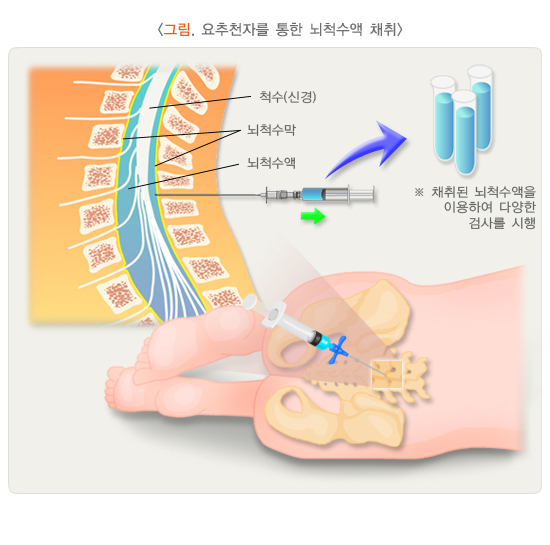 뇌막염을 감별하고 원인을 밝혀내는 데 가장 중요한 검사는 뇌척수액 검사입니다. 뇌척수액은 지주막 속에 들어있는 액체로 뇌막과 뇌척수 사이를 채우고 있기 때문에 뇌척수액을 뽑아 검사를 해 보면 뇌막염을 진단하는 데 필요한 다양한 정보를 얻을 수 있습니다. 뇌척수액을 뽑기 위해서는 요추천자를 시행해야 하는데, 일반적으로 환자가 옆으로 웅크리고 누운 자세에서 등을 통해 가늘고 긴 바늘을 찔러 뇌척수액을 채취합니다.