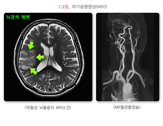 자기공명영상(MRI)은 CT와 함께 뇌졸중 진단 시 많이 사용되는 검사로서 자기장을 이용하여 몸의 단면 영상을 얻습니다. MRI의 장점은 CT보다 초기의 뇌경색 혹은 작은 크기의 뇌경색을 예민하게 잘 발견하고, 뇌종양 등 다른 진단과의 구별을 쉽게 할 수 있도록 많은 정보를 제공하는 것입니다. 그러나 일부 심장 박동기와 같이 금속성 부착물을 가진 환자는 검사를 시행할 수 없으며, CT보다 검사 시간이 더 많이 걸린다는 단점이 있습니다. 한편 혈관의 상태를 촬영하는 자기공명혈관조영술(Magnetic Resonance Angiography, MRA)을 시행하면 뇌혈관 상태도 쉽게 확인할 수 있습니다.