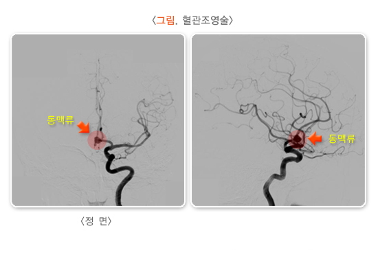 혈관 조영술이란 X-선을 투과시키지 않는 조영제를 혈관 속으로 주입하고, X-선 사진을 촬영함으로써 혈관의 영상을 얻는 검사법입니다. 우선 가는 카테터(도관)를 경동맥이나 쇄골하정맥, 상완동맥 또는 대퇴동맥 등을 통해 삽입하고, 촬영을 원하는 혈관 근처까지 전진시킨 후, 도관을 통해 소량씩의 조영제를 주사기로 주입하면서 사진을 촬영합니다. 혈관 조영술은 혈관을 정확히 볼 수 있는 장점이 있지만, 침습적인 검사법이기도 합니다. 뇌혈관 및 혈역학적 상태, 그리고 뇌동맥류의 모양이나 뇌혈관 기형 상태를 정확히 평가하기 위한 진단적인 목적 이외에도, 뇌혈관을 통한 응급 혈전 제거술 혹은 스텐트 시술을 위한 치료 목적으로도 시행합니다.