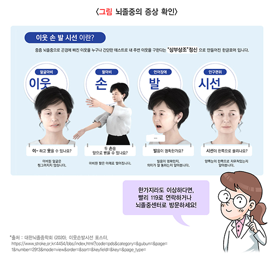 중증 뇌졸중의 경우 주변에 있는 다른 사람의 도움을 통해서만 치료 시간 내에 적절한 병원에 방문할 수 있어서, 요즘은 환자 본인뿐 아니라 주변인을 대상으로 하는 캠페인을 벌이고 있습니다.