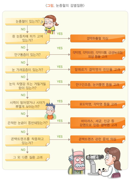 세극등검사, 시력과 안압 측정, 필요 시 산동 후 안저검사 등을 할 수 있으며 면밀한 안과 검진을 통해 원인 질환을 파악할 수 있습니다. 결막 혈관의 확장 혹은 증식으로 인한 충혈인지, 결막의 아래에 위치한 공막 혈관의 확장이 동반되어 있는지, 눈꺼풀 결막의 변화가 동반되어 있지는 않는지, 각막의 염증이나 상처는 없는지, 전방 염증은 없는지 등을 평가합니다.