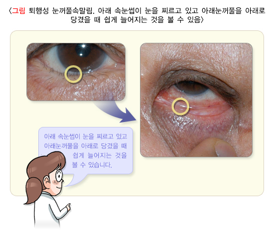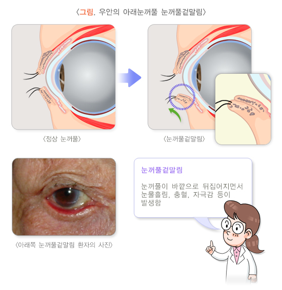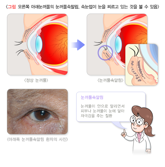 눈꺼풀 안쪽의 흉터와 아래눈꺼풀을 당기는 근육의 손상으로 인해 눈꺼풀이 눈의 안쪽 방향으로 말리게 되는 것을 말합니다.