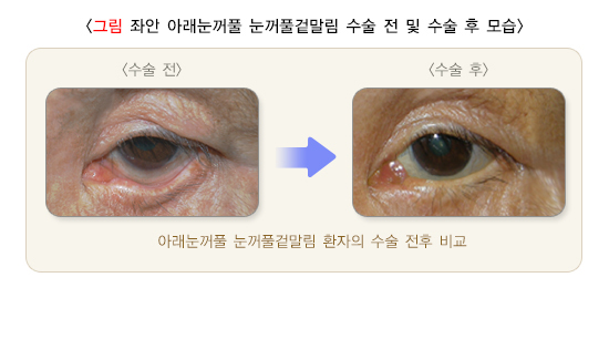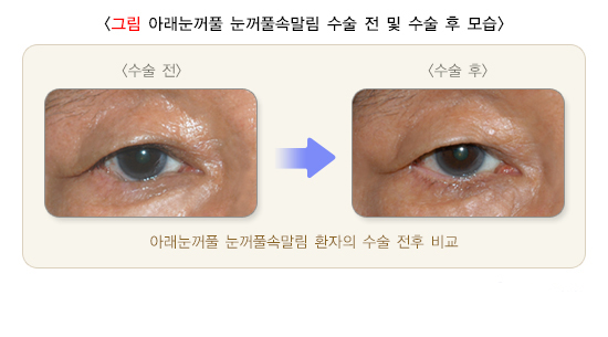 눈꺼풀속말림 중 가장 흔한 퇴행성 눈꺼풀속말림의 경우 아래눈꺼풀을 당겨주는 근육을 눈꺼풀판에 부착시키고 눈꺼풀의 수평이완이 있는 경우 이를 단축시켜주는 수술이 보편적으로 시행됩니다.