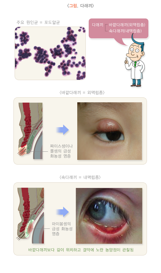 바깥다래끼는 눈꺼풀 표면에 가까이 위치합니다. 초기에는 약간 빨갛게 붓고 가려운데, 곧 심하게 부어오르며 통증이 생깁니다. 며칠이 지나면 단단해지고 통증이 감소하며 농양(고름집)이 생기면서 결국은 피부로 배출됩니다. 그러나 경우에 따라서는 인접한 속눈썹뿌리로 감염이 확대되어 다발성으로 발생할 수도 있고, 자주 재발하기도 합니다. 속다래끼는 바깥다래끼보다 눈꺼풀 깊숙이 위치하고 눈꺼풀판결막에 노란 농양점이 관찰되는 것으로 구별할 수 있습니다.