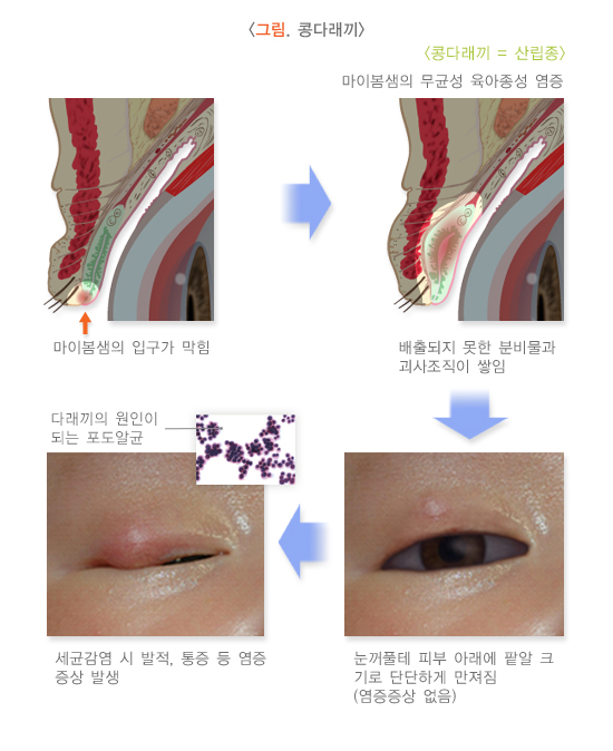 콩다래끼는 세균감염이 아니고 마이봄샘의 배출구가 막히면서 배출되지 않은 기름 성분이 눈꺼풀판과 주위 조직으로 침윤되어 생긴 만성적인 육아종성 염증입니다. 간혹 세균에 감염되면 속다래끼와 비슷한 모습을 보이기도 합니다.