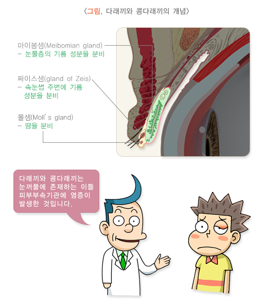 눈꺼풀에는 다른 피부와 마찬가지로 여러 분비샘들이 있습니다. 눈꺼풀 바깥쪽으로는 속눈썹 주변에 땀을 분비하는 샘(몰샘, Moll's gland), 기름 성분을 분비하는 피지샘(짜이스샘, gland of Zeis)이 있고 안쪽으로는 눈꺼풀판 안에 눈물층의 기름 성분을 분비하는 마이봄샘(Meibomian gland) 등이 있습니다. 다래끼와 콩다래끼는 이러한 눈꺼풀의 분비샘에 생기는 염증질환을 말합니다.