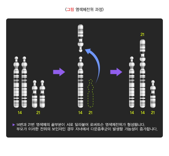 다운 증후군은 유전학적으로 세 종류로 구분됩니다. 다운 증후군의 95%는 모든 세포에 21번 염색체를 세 개 보유하고 있는 '삼체성 다운 증후군'입니다. 다운 증후군의 약 4%는 정상 21번 염색체 2개가 있으면서 다른 염색체에 추가로 부착된 21번 염색체(전위 염색체)를 더 보유하여 양적으로 21번 염색체가 3개가 되는 '전위성 다운 증후군'입니다. 나머지 1%는 신체의 일부 세포에만 21번 염색체를 세 개 보유하고 있는 '모자이크성 다운 증후군'입니다.